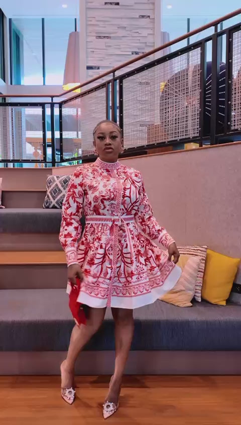 Elegant Red & White Printed Mini Dress