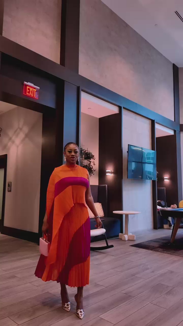 Turn heads in this bold Miyake-inspired two-piece set, crafted with precision pleating and striking color contrasts. Featuring a sleeveless high-neck top with an asymmetric overlay, it flows seamlessly into a coordinating pleated midi skirt. The fiery orange base is elevated with sweeping waves of rich magenta, creating a dynamic and artistic look.