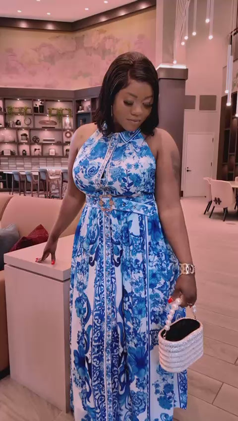 Turn heads in timeless sophistication with our Ayah Blue Elegance Maxi Dress. Featuring a high halter neckline and a flowing A-line silhouette, this dress brings both grace and comfort. The striking blue floral and baroque-inspired print on crisp white fabric adds a bold yet feminine charm, while the belted waist with gold buckle detail beautifully accentuates your curves.